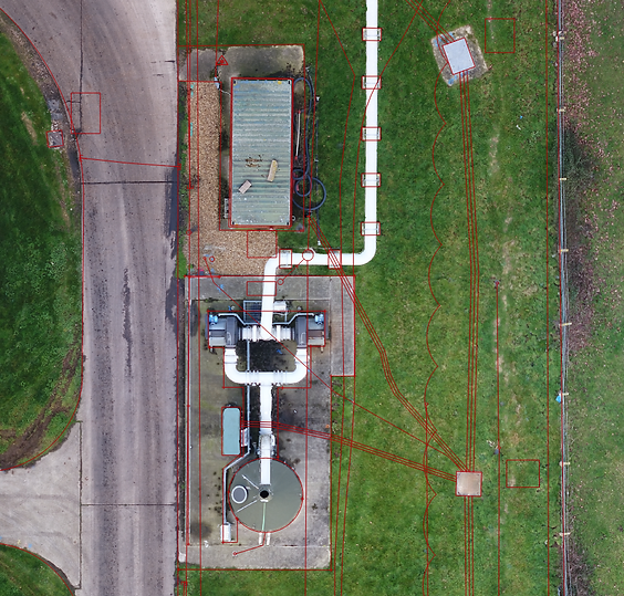 The digital data gives some great insights into the location of utilities onsite from a visual perspective. The 2D orthomosaic is orthorectified and tied into the OS grid so it can be easily imported into AutoCAD, GIS or BIM systems and design models overlaid. The 2D orthomosaic was produced from a drone survey and then combined with a CAD model (DWG).